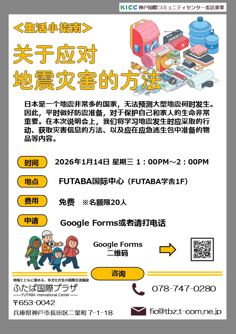 日本是一个地震非常多的国家,无法预测大型地震何时发生。因此,平时做好防震准备,对于保护自己和家人的生命非常重要。在本次说明会上,我们将学习地震发生时应采取的行动、获取灾害信息的方法、以及应在应急逃生包中准备的物品等内容。
