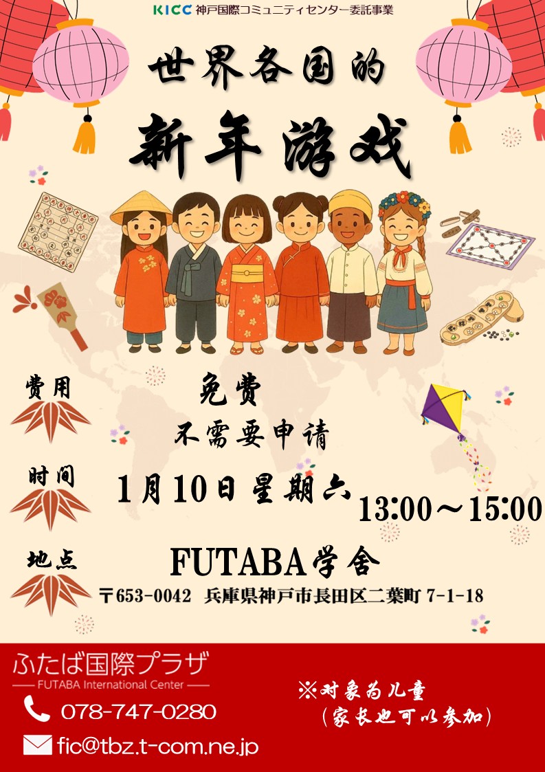 新年世界各国的传统游戏体验活动要举办啦!2025.12.12 我们将在1月10日(星期六)13:00至15:00举办新年世界各国的传统游戏体验活动! 活动地点:FUTABA国际中心(FUTABA学舍1楼右侧最里边) 兵庫県神戸市長田区二葉町7-1-18 欢迎大家踊跃参加,共度欢乐的新年时光! « 前の記事へ 次の記事へ » ふたば国際プラザ > 記事一覧 > 中文 > 新年世界各国的传统游戏体验活动要举办啦!