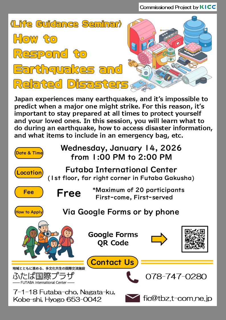 Japan experiences many earthquakes, and it’s impossible to predict when a major one might strike. For this reason, it’s important to stay prepared at all times to protect yourself and your loved ones. In this session, you will learn what to do during an earthquake, how to access disaster information, and what items to include in an emergency bag, etc.