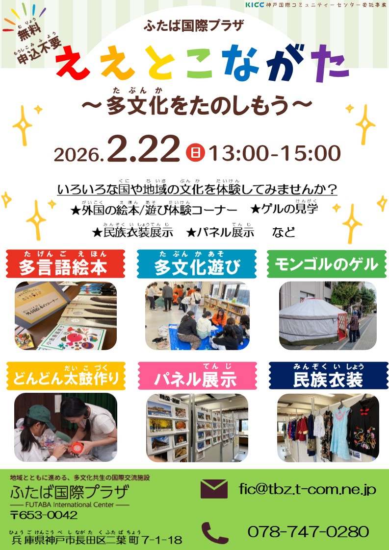 ふたば国際プラザでは、おおよそ小学生とその保護者を対象とした相互理解イベントとして「ええとこながた~多文化をたのしもう~」を開催します。