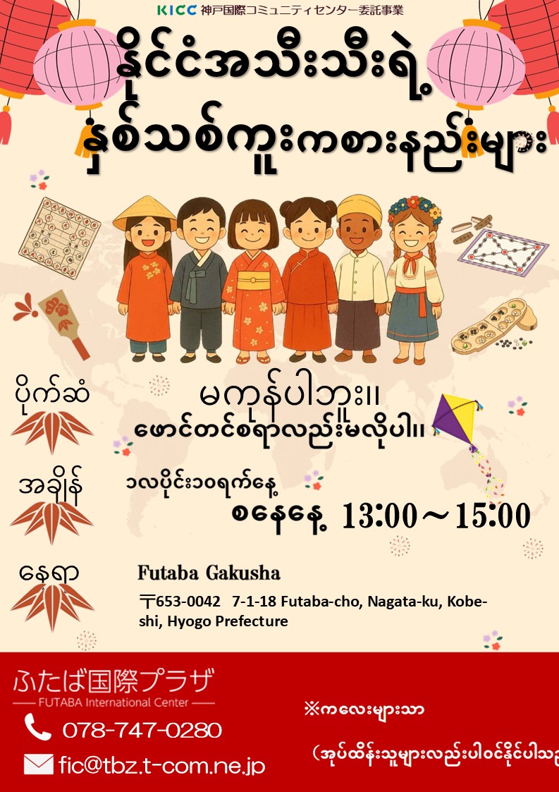 ကျွန်ုပ်တို့သည် ဇန်နဝါရီလ ၁၀ ရက် (စနေနေ့) တွင် မွန်းလွဲ ၁ နာရီမှ ၃ နာရီထိ နိုင်ငံအများ၏ အနှစ်သစ်ပွဲ पारंपရိကကစားရင်းများ ကို အတွေ့အကြုံရနိုင်သည့် အकार्यक्रमကို ကျင်းပမည် ဖြစ်ပါတယ်။