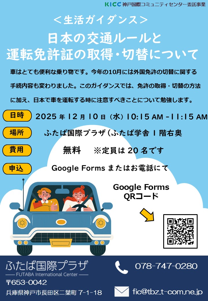今年の10月には外国免許の切替に関する手続内容も変わりました。このガイダンスでは、免許の取得・切替の方法に加え、日本で車を運転する時に注意すべきことについて勉強します。